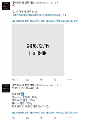 전투 참여자 전원이 순서대로 자신의 차례를 마치면, 한 턴이 종료됩니다. 턴 종료 고지는 진행계정의 퍼블릭 트윗과, 해당